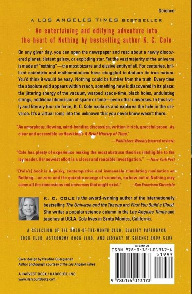 An adventure into the heart of Nothing by best-selling author K. C. Cole. Once again, acclaimed science writer K. C. Cole brings the arcane and academic down to the level of armchair scientists in The Hole in the Universe, an entertaining and edifying search for nothing at all. Open the newspaper on any given day and you will read of a newly discovered planet, star, and so on. Yet scientists and mathematicians have spent generations searching the far reaches of the universe for that one elusive state-nothingness. Although this may sound like a simple task, every time the absolute void appears within reach, something new is discovered in its place: a black hole, an undulating string, an additional dimension of space or time-even another universe. A fascinating and literary tour de force, The Hole in the Universe is a virtual romp into the unknown that you never knew wasn't there.