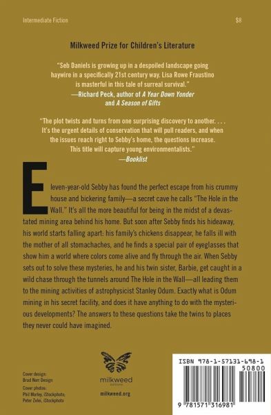 Eleven-year-old Sebby has found the perfect escape from his crummy house and bickering family--a secret cave he calls "The Hole in the Wall." He discovers this astonishing cave in a pristine, beautiful glen in the midst of a devastated mining area behind his home. But it's not long after Sebby's found it that his world starts falling apart: His family's chickens disappear, colors start jumping off the wall and coming to life, and after sneaking a taste of raw cookie dough he finds himself with the mother of all stomachaches. When Sebby sets out to solve these mysteries, he and his twin sister Barbie get caught in a wild chase through the tunnels and caverns around The Hole in the Wall--all leading them to the mining activities of one Stanley Odum, the hometown astrophysicist who's buying up all the land behind Sebby's home. Exactly what is Mr. Odum mining in his secret facility, and does it have anything to do with the mystery of the lost chickens and Sebby's stomachache? The answers to these questions go much further than the twins ever imagined.