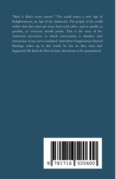 "Man is Man's worst enemy." The world enters a new Age of Enlightenment, an Age of the Antisocial. The people of the world realize that they must get away from each other, and as quickly as possible, or everyone should perish. This is the story of the Antisocial movement, in which conversation is obsolete, and interaction of any sort is outdated. And when Congressman Samuel Hastings wakes up in this world, he has no idea what had happened. He finds the first of many Americans to be quarantined.
