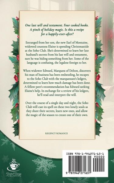 One last will and testament. Four cooked books. A pinch of holiday magic. Is this a recipe for a happily-ever-after? Estranged from her son, the new Earl of Montaine, widowed countess Elaine is spending Christmastide at the Soho Club. She's determined to learn her late husband's secrets from his last will and testament, sure he was hiding something from her. Some of the language is confusing, though, the legalese foreign to her. When widower Edward, Marquess of Delton, discovers his man of business has been embezzling, he escapes to the Soho Club with the marquessate's ledgers, determined to learn how much damage has been done. During breakfast, a fellow peer's recommendation has Edward seeking Elaine's help. In exchange for a review of his ledgers, he'll read and interpret the will. Over the course of a single day and night, the Soho Club will cast its spell on these two lonely souls as they share their secrets, learn new ones, and allow the magic of the season to create one of their own.