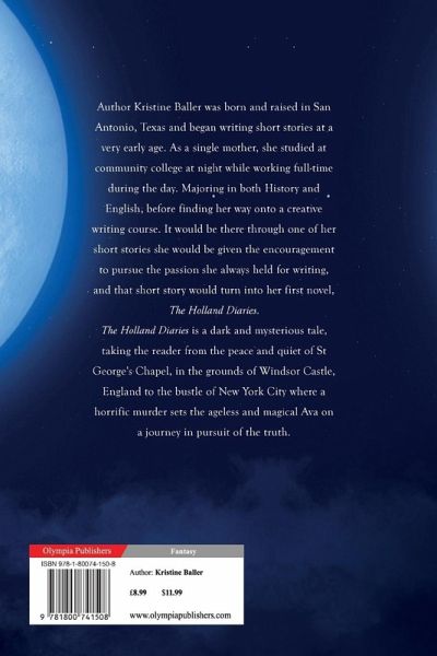 Author Kristine Baller was born and raised in San Antonio, Texas and began writing short stories at a very early age. As a single mother, she studied at community college at night while working full-time during the day. Majoring in both History and English, before finding her way onto a creative writing course. It would be there through one of her short stories she would be given the encouragement to pursue the passion she always held for writing, and that short story would turn into her first novel, The Holland Diaries. The Holland Diaries is a dark and mysterious tale, taking the reader from the peace and quiet of St George's Chapel, in the grounds of Windsor Castle, England to the bustle of New York City where a horrific murder sets the ageless and magical Ava on a journey in pursuit of the truth.