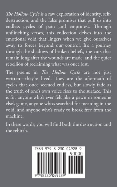 The Hollow Cycle is a raw exploration of identity, self-destruction, and the false promises that pull us into endless cycles of pain and emptiness. Through unflinching verses, this collection delves into the emotional void that lingers when we give ourselves away to forces beyond our control. It's a journey through the shadows of broken beliefs, the cuts that remain long after the wounds are made, and the quiet rebellion of reclaiming what was once lost. The poems in The Hollow Cycle are not just written-they're lived. They are the aftermath of cycles that once seemed endless, but slowly fade as the truth of one's own voice rises to the surface. This is for anyone who's ever felt like a pawn in someone else's game, anyone who's searched for meaning in the void, and anyone who's ready to break free from the machine. In these words, you will find both the destruction and the rebirth.
