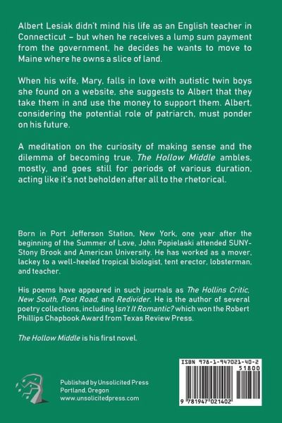 Born in Port Jefferson Station, New York, one year after the beginning of the Summer of Love, John Popielaski attended SUNY-Stony Brook and American University. He has worked as a mover, lackey to a well-heeled tropical biologist, tent erector, lobsterman, and teacher. His poems have appeared in such journals as The Hollins Critic, New South, Post Road, and Redivider. He is the author of several poetry collections, including Isn't It Romantic? which won the Robert Phillips Chapbook Award from Texas Review Press. The Hollow Middle is his first novel.