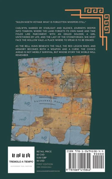 Act II of Book One of the Tharion Cycle In the mist-veiled ruins of a crumbling empire, the Bell tolls-and the world begins to unravel. As Caelwyn ventures deeper into Tharion, where memory dissolves and the Wyrd sings in silence, the path leads her to the Hollow Vale. There, the ground forgets its shape, the air erases names, and the ancient Bell waits beneath fractured stars. Accompanied by a soldier burdened by lost oaths, a smith who hears the stone's sorrow, and a girl untethered by time, Caelwyn must face the cost of remembering a land that is trying to forget itself. "Sulen noeth vethar: what is forgotten whispers still." The Hollow Vale: Act II continues the mythic saga of Tharion, where starlight, prophecy, and silence collide in a battle not of swords, but memory itself. For fans of Tolkien, Le Guin, and Susanna Clarke, this is a story where sacrifice hums through every breath, and the Bell's toll reshapes the threads of time. The Hollow Vale (Acts I, II and III) is the first book in The Tharion Cycle, a mythic fantasy saga steeped in folklore, lyrical prose, and the quiet magic of things that were meant to be forgotten. For fans of Tolkien, Le Guin, and Tamsyn Muir, this is a story where memory is sacred, silence is dangerous, and language is the last line between the world and what waits beneath.
