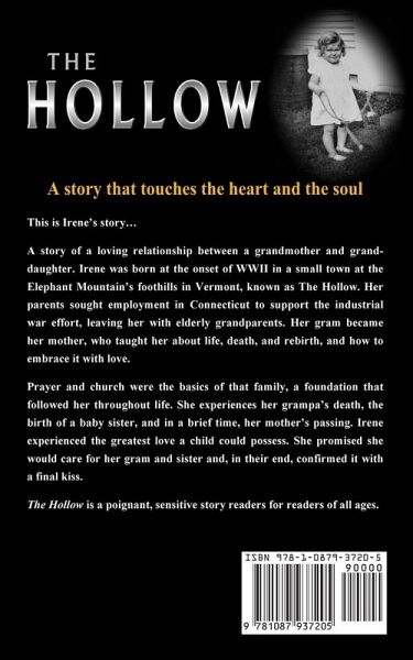 The Hollow is Irene's story, and the loving relationship between a grandmother and granddaughter. A pathology of metaphorical memories in short story form. Irene was born at the onset of WWII, in a small town at the Elephant Mountain's foothills, known as The Hollow, in Vermont. Her parents sought employment in Connecticut to support the industrial war effort, leaving their infant baby, Irene, with her elderly grandparents. Her gram became her mother, who taught her at an early age about life, death, and rebirth at a systemic level, and how to embrace it with love. Prayer and church were the basics of the family, and a foundation that followed her throughout life. A naive country girl whose best friend was Bessie, the cow. Gram taught her to read and write from the Bible. She experiences her grampa's death, the birth of a baby sister, and in a brief time, her mother's passing. All the stories are heartfelt embedded memories; from Irene's gram teaching her to swim, and her fifth Christmas present, a red hair ribbon. Throughout her life, she had the greatest love and foundation a child could possess. She promised she would care for her gram and sister and, in their end, validated it with a final kiss. The Hollow is a poignant, sensitive story readers of all ages will enjoy.