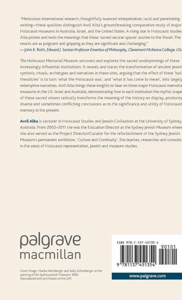 The Holocaust Memorial Museum reveals and traces the transformation of ancient Jewish symbols, rituals, archetypes and narratives deployed in these sites. Demonstrating how cloaking the 'secular' history of the Holocaust in sacred garb, memorial museums generate redemptive yet conflicting visions of the meaning and utility of Holocaust memory.