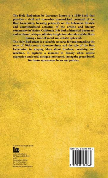 The Holy Barbarians by Lawrence Lipton is a 1959 book that provides a vivid and somewhat romanticized portrayal of the Beat Generation, focusing primarily on the bohemian lifestyle and countercultural activities of the artistic and literary community in Venice, California. It is both a historical document and a cultural critique, offering insight into the ethos of the Beats during a time of social and artistic upheaval. The Holy Barbarians is a valuable resource for understanding the roots of 20th-century counterculture and the role of the Beat Generation in shaping ideas about freedom, creativity, and rebellion. It captures a moment in history when artistic expression and social critique intersected, laying the groundwork for future movements in art and politics.