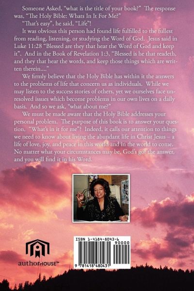 Someone Asked, "what is the title of your book?" The response was, "The Holy Bible: Whats In It For Me?" "That's easy", he said, "Life"! It was obvious this person had found life fulfilled to the fullest from reading, listening, or studying the Word of God. Jesus said in Luke 11:28 "Blessed are they that hear the Word of God and keep it". And in the Book of Revelation 1:3, "Blessed is he that readeth, and they that hear the words, and keep those things which are written therein...." We firmly believe that the Holy Bible has within it the answers to the problems of life that concern us as individuals. While we may listen to the success stories of others, yet we ourselves face unresolved issues which become problems in our own lives on a daily basis. And so we ask, "what about me?" We must be made aware that the Holy Bible addresses your personal problem. The purpose of this book is to answer your question, "What's in it for me"? Indeed, it calls our attention to things we need to know about living the abundant life in Christ Jesus - a life of love, joy, and peace in this world and in the world to come. No matter what your circumstances may be, God's got the answer, and you will find it in his Word.