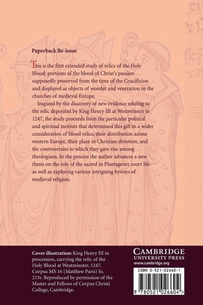 The first extended study of relics of the Holy Blood: portions of the blood of Christ's passion preserved supposedly from the time of the Crucifixion and displayed as objects of wonder and veneration in the churches of medieval Europe. Inspired by the discovery of new evidence relating to the relic deposited by King Henry III at Westminster in 1247, the study proceeds from the particular political and spiritual motives that inspired this gift to a wider consideration of blood relics, their distribution across western Europe, their place in Christian devotion, and the controversies to which they gave rise among theologians. In the process the author advances a new thesis on the role of the sacred in Plantagenet court life as well as exploring various intriguing byways of medieval religion.