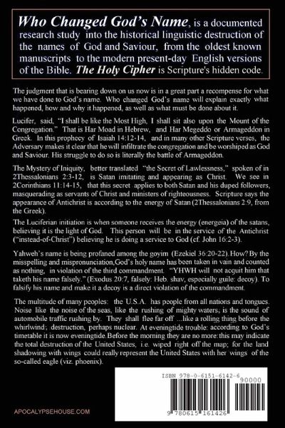 Norbert H. Kox has researched the Bible in its original languages for more than 30 years, and presents his startling findings here. â¿¿Modern Christianity has been duped. Without ever knowing it, the Antichrist they are warning against has already infiltrated the Church.â¿¿ The Key of knowledge has been hidden and the names of God and Saviour gradually removed from common use without raising suspicion or inciting controversy. The two most important names in the history of mankind have been all but obliterated from existence. Where these names are still in tact they are being undermined, by missionaries who believe they are doing a service to God. This treatise is part of a documented research study into the historical linguistic changes in the names of God and Saviour, from the oldest known manuscripts to the modern present-day English versions of the Bible. Along with solid historical and etymological evidence, symmetrical Bible codes are presented as irrefutable ratification.