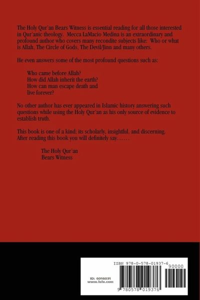 The Holy Qur'an Bears Witness is essential reading for all those interested in Qur'anic theology. Mecca LaMacio Medina is an extraordinary and profound author who covers many recondite subjects like: Who or what is Allah, The Circle of Gods, The Devil/Jinn and many others.