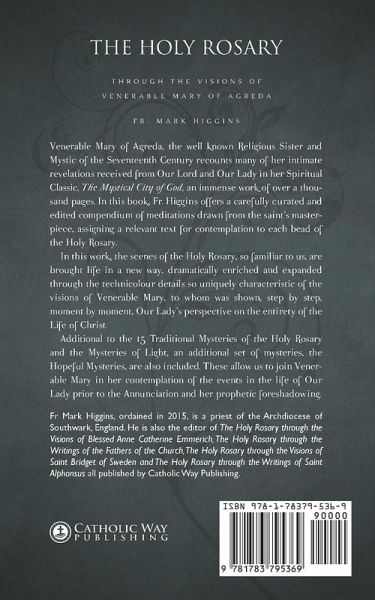 Venerable Mary of Agreda, the well known Religious Sister and Mystic of the Seventeenth Century recounts many of her intimate revelations received from Our Lord and Our Lady in her Spiritual Classic, The Mystical City of God, an immense work of over a thousand pages. In this book, Fr. Higgins offers a carefully curated and edited compendium of meditations drawn from the saint's masterpiece, assigning a relevant text for contemplation to each bead of the Holy Rosary. In this work, the scenes of the Holy Rosary, so familiar to us, are brought life in a new way, dramatically enriched and expanded through the technicolour details so uniquely characteristic of the visions of Venerable Mary, to whom was shown, step by step, moment by moment, Our Lady's perspective on the entirety of the Life of Christ. Additional to the 15 Traditional Mysteries of the Holy Rosary and the Mysteries of Light, an additional set of mysteries, the Hopeful Mysteries, are also included. These allow us to join Venerable Mary in her contemplation of the events in the life of Our Lady prior to the Annunciation and her prophetic foreshadowing.