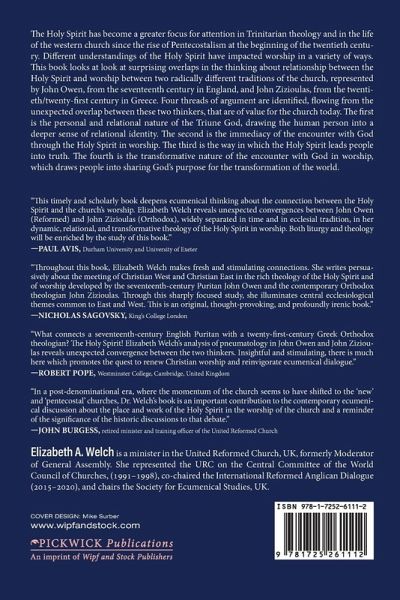 The Holy Spirit has become a greater focus for attention in Trinitarian theology and in the life of the western church since the rise of Pentecostalism at the beginning of the twentieth century. Different understandings of the Holy Spirit have impacted worship in a variety of ways. This book looks at look at surprising overlaps in the thinking about relationship between the Holy Spirit and worship between two radically different traditions of the church, represented by John Owen, from the seventeenth century in England, and John Zizioulas, from the twentieth/twenty-first century in Greece. Four threads of argument are identified, flowing from the unexpected overlap between these two thinkers, that are of value for the church today. The first is the personal and relational nature of the Triune God, drawing the human person into a deeper sense of relational identity. The second is the immediacy of the encounter with God through the Holy Spirit in worship. The third is the way in which the Holy Spirit leads people into truth. The fourth is the transformative nature of the encounter with God in worship, which draws people into sharing God's purpose for the transformation of the world.