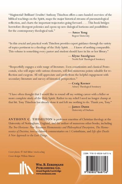 This learned book by eminent scholar Anthony Thiselton is a detailed biblical, historical, and contemporary study of the Holy Spirit. Thiselton presents an up-to-date account of biblical teaching on the topic, including exposition of passages and hermeneutics; offers a comprehensive historical survey from the Apostolic Fathers to Jonathan Edwards; and engages a host of modern theologians. In the last part of his book Thiselton discusses a remarkably wide range of writings on the Holy Spirit from the nineteenth century to the present day. He interacts explicitly with Pentecostals and the Renewal Movement in a sympathetic, positive, yet critical manner. The book as a whole is at once scholarly and readable, comprehensive and practical. The Holy Spirit -- in Biblical Teaching, through the Centuries, and Today offers scholarly work on specific themes such as prophecy, tongues, the miraculous, the range and nature of the Spirit's gifts, and the Holy Spirit in relation to the Trinity, along with practical consequences for worship and life.