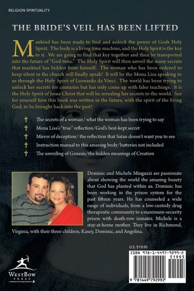 The Bride's Veil has been lifted Mankind has been made to find and unlock the power of Gods Holy Spirit. The body is a living time machine, and the Holy Spirit is the key to it. We are going to find that key together and then be transported into the future of "God time." The Holy Spirit will then unveil the many secrets that mankind has hidden from himself. The woman who has been ordered to keep silent in the church will finally speak! It will be the Mona Lisa speaking to us through the Holy Spirit of Leonardo da Vinci. The world has been trying to unlock her secrets for centuries but has only come up with false teachings. It is the Holy Spirit of Jesus Christ that will be revealing her secrets to the world. See for yourself how this book was written in the future, with the spirit of the living God, to be brought back into the past! The secrets of a woman/ what the woman has been trying to say Mona Lisa's "true" reflection/God's best-kept secret Mirror of deception/ the reflection that Satan doesn't want you to see Instruction manual to this amazing body/batteries not included The unveiling of Genesis/the hidden meanings of Creation