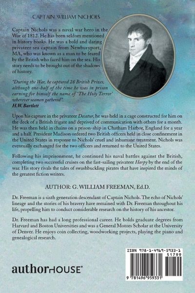 CAPTAIN WILLIAM NICHOLS Captain Nichols was a naval war hero in the War of 1812. He has been seldom mentioned in history books. He was a bold and daring privateer sea captain from Newburyport, MA, who was known as a man to be feared by the British who faced him on the sea. His story needs to be brought out of the shadows of history. "During the War, he captured 28 British Prizes, although one-half of the time he was in prison earning for himself the name of 'The Holy Terror' wherever seamen gathered". H.W. Bartlett Upon his capture in the privateer Decatur, he was held in a cage constructed for him on the deck of a British frigate and deprived of communication with others for a month. He was then held in chains on a prison-ship in Chatham Harbor, England for a year and a half. President Madison ordered two British officers held in close confinement in the United States in response to Nichols' cruel and inhumane treatment. Nichols was eventually exchanged for the two officers and returned to the United States. Following his imprisonment, he continued his naval battles against the British, completing two successful cruises on the fast-sailing privateer Harpy by the end of the war. His story rivals the tales of swashbuckling pirates that have inspired the minds of the greatest fiction writers.