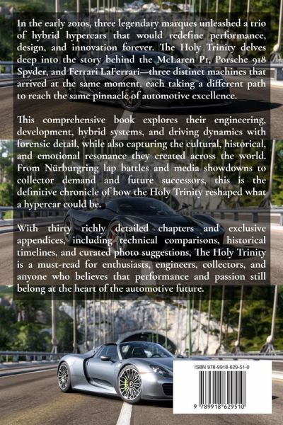 In the early 2010s, three legendary marques unleashed a trio of hybrid hypercars that would redefine performance, design, and innovation forever. The Holy Trinity delves deep into the story behind the McLaren P1, Porsche 918 Spyder, and Ferrari LaFerrari-three distinct machines that arrived at the same moment, each taking a different path to reach the same pinnacle of automotive excellence. This comprehensive book explores their engineering, development, hybrid systems, and driving dynamics with forensic detail, while also capturing the cultural, historical, and emotional resonance they created across the world. From Nürburgring lap battles and media showdowns to collector demand and future successors, this is the definitive chronicle of how the Holy Trinity reshaped what a hypercar could be. With thirty richly detailed chapters and exclusive appendices, including technical comparisons, historical timelines, and curated photo suggestions, The Holy Trinity is a must-read for enthusiasts, engineers, collectors, and anyone who believes that performance and passion still belong at the heart of the automotive future.
