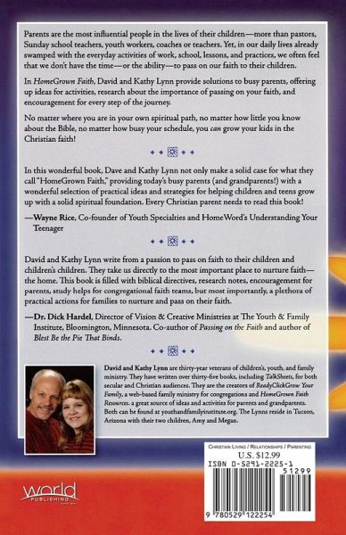 No matter where you are in your own spiritual journey, no matter how little you know about the Bible, no matter how busy your schedule, you CAN grow your kids in Christian faith! Parents of faith are the most influential people in the lives of children - more than pastors, Sunday School teachers, youth workers, or teachers. Passing our faith to our kids is the responsibility of the church (home grown faith versus church grown faith). There are certain conditions that parents can intentionally create in the home that will leave a legacy of faith for their childre, grandchildren, and beyond. They include prayer and devotions; family acts of service; caring conversations; and rituals and traditions. Home Grown Faith will encourage and teach parents how they can shape the spiritual future of their kids one day at a time.