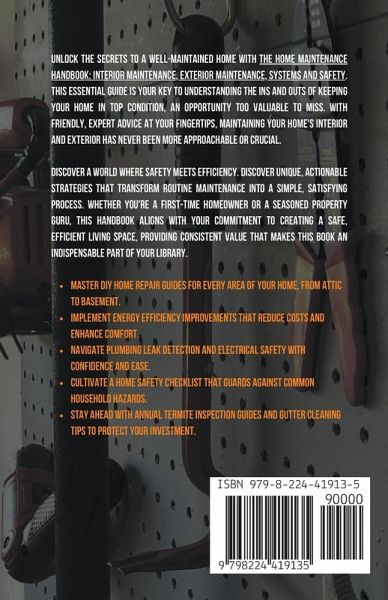Transform your home into a sanctuary of safety and comfort with The Home Maintenance Handbook: Interior Maintenance, Exterior Maintenance, Systems and Safety. This indispensable guide empowers homeowners to master the essentials of home upkeep, ensuring every corner of your living space remains in pristine condition. Key Highlights:Comprehensive coverage of interior maintenance tips and exterior home upkeep Expert advice on HVAC maintenance, plumbing leak detection, and electrical safety at home Innovative strategies for energy efficiency improvements and mold prevention Dive deep into the realm of home maintenance with chapters meticulously crafted to guide you through each aspect of your home's care. From the foundational elements of your abode to the pinnacle of your roof, every detail is addressed with precision and clarity. Inside You'll Discover:Step-by-step guides on gutter cleaning and foundation maintenance tips Proven techniques for attic inspection and maintaining optimal home safety Best practices for termite inspection and creating a robust home security system review The first section of the book, Interior Maintenance, serves as your ultimate playbook for indoor care. Learn how to enhance your home's air quality with a DIY home repair guide for HVAC filters, tackle plumbing leak detection like a pro, and ensure your family's safety with smoke and carbon monoxide detector maintenance. Transitioning to Exterior Maintenance, the book equips you with the knowledge to fortify your home against the elements. Whether it's mastering gutter cleaning or conducting a thorough termite inspection guide, you'll be prepared to protect and preserve your home's exterior integrity. In the Systems and Safety section, discover how to audit your home energy use, implement home safety checklists, and ensure your living space is not just a house, but a secure and energy-efficient home. Why Choose This Book?Tailored advice for homeowners keen on DIY improvements and maintenance Actionable tips and tricks to tackle home maintenance tasks confidently Insightful recommendations to enhance your home's safety, efficiency, and longevity Embark on a journey to elevate your home maintenance skills with "The Home Maintenance Handbook." Whether you're a seasoned homeowner or new to the realm of home care, this book is your quintessential resource for creating a safe, efficient, and well-maintained living environment. Take Action Now! Don't wait until small issues become major problems. Grab your copy today and step into a world of informed home maintenance, where every task is an opportunity to enhance your living space and quality of life. Invest in your home's future - secure your copy of "The Home Maintenance Handbook" now!