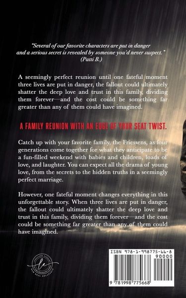 A Family Reunion with an edge of your seat twist. A seemingly perfect reunion until one fateful moment three lives are put in danger, the fallout could ultimately shatter the deep love and trust in this family, dividing them forever-and the cost could be something far greater than any of them could have imagined. "Several of our favorite characters are put in danger and a serious secret is revealed by someone you'd never suspect." (Patti B.) "A Friessen book would not be complete without family drama and boy does this one deliver the drama, almost from page one!" -H. Mitchell Catch up with your favorite family, the Friessens, as four generations come together for what they anticipate to be a fun-filled weekend with babies and children, loads of love, and laughter. You can expect all the drama of young love, from the secrets to the hidden truths in a seemingly perfect marriage. However, one fateful moment changes everything in this unforgettable story. When three lives are put in danger, the fallout could ultimately shatter the deep love and trust in this family, dividing them forever-and the cost could be something far greater than any of them could have imagined.