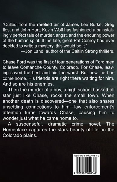 "Culled from the rarefied air of James Lee Burke, Greg Iles, and John Hart, Kevin Wolf has fashioned a painstakingly perfect tale of murder, angst, and the enduring power of the human spirit. If the late, great Pat Conroy had ever decided to write a mystery, this would be it." -Jon Land, author of the Caitlin Strong thrillers. "Kevin Wolf's debut novel, The Homeplace, succeeds in every way. He has crafted a gripping, fast-paced narrative with beautifully drawn characters in an authentic and interesting small-town Colorado setting. Not only is the mystery compelling, but so are the characters. Even if there were no murders to solve, you would still want to spend time with these fascinating people whose lives echo the sparse and gorgeous landscape they inhabit and whose pasts refuse to leave them to their futures." -Christine Carbo, author of The Wild Inside Chase Ford was the first of four generations of Ford men to leave Comanche County, Colorado. For Chase, leaving saved the best and hid the worst. But now, he has come home. His friends are right there waiting for him. And so are his enemies. Then the murder of a boy, a high school basketball star just like Chase, rocks the small town. When another death is discovered-one that also shares unsettling connections to him-law enforcement's attention turns towards Chase, causing him to wonder just what he came home to. A suspenseful, dramatic crime novel, The Homeplace captures the stark beauty of life on the Colorado plains.