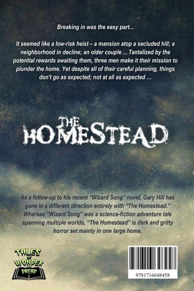 Breaking in was the easy part... It seemed like a low-risk heist - a mansion atop a secluded hill; a neighborhood in decline; an older couple. Tantalized by the potential rewards awaiting them, three men make it their mission to plunder the home. Yet despite all of their careful planning, things don't go as expected; not at all as expected... As a follow-up to his recent novel "Wizard Song," Gary Hill has gone in a different direction entirely with "The Homestead." Whereas "Wizard Song" was a science-fiction adventure tale spanning multiple worlds, "The Homestead" is dark and gritty horror that is predominantly set in a single large home.
