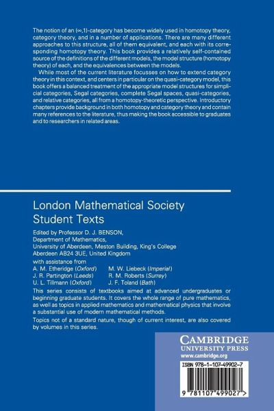The notion of an (¿,1)-category has become widely used in homotopy theory, category theory, and in a number of applications. There are many different approaches to this structure, all of them equivalent, and each with its corresponding homotopy theory. This book provides a relatively self-contained source of the definitions of the different models, the model structure (homotopy theory) of each, and the equivalences between the models. While most of the current literature focusses on how to extend category theory in this context, and centers in particular on the quasi-category model, this book offers a balanced treatment of the appropriate model structures for simplicial categories, Segal categories, complete Segal spaces, quasi-categories, and relative categories, all from a homotopy-theoretic perspective. Introductory chapters provide background in both homotopy and category theory and contain many references to the literature, thus making the book accessible to graduates and to researchers in related areas.