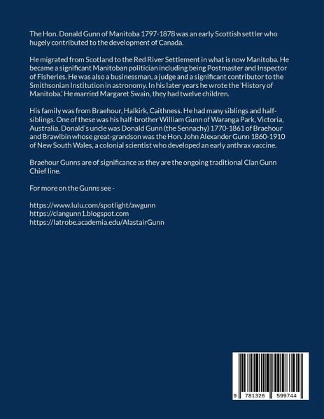 The Hon. Donald Gunn of Manitoba 1797-1878 was an early Scottish settler who hugely contributed to the development of Canada. He migrated from Scotland to the Red River Settlement in what is now Manitoba. He became a significant Manitoban politician including being Postmaster and Inspector of Fisheries. He was also a businessman, a judge and a significant contributor to the Smithsonian Institution in astronomy. In his later years he wrote the History of Manitoba. He married Margaret Swain, they had twelve children. His family was from Braehour, Halkirk, Caithness. He had many siblings and half-siblings. One of these was his half-brother William Gunn of Waranga Park, Victoria, Australia. Donald's uncle was Donald Gunn (the Sennachy) 1770-1861 of Braehour and Brawlbin whose great-grandson was the Hon. John Alexander Gunn 1860-1910 of New South Wales, a colonial scientist who developed an early anthrax vaccine. Braehour Gunns are of significance as they are the ongoing traditional Clan Gunn Chief line. For more on the Gunns see - https://www.lulu.com/spotlight/awgunn https://clangunn1.blogspot.com https://latrobe.academia.edu/AlastairGunn