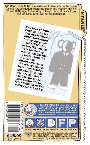 THE BEAR FROM AUNT is an illustrated fiction series for mid-grade readers featuring the super-koala-spy Stanley. Stanley as the "Bear From AUNT" with his fellow A.U.N.T. agents work to keep the world safe from evil geniuses...and evil not-so-geniuses. THE HONEY DON'T CASE is an expanded version of the original 2015 volume with an expanded story and all new artwork! In THE HONEY DON'T CASE, we are introduced to AUNT's senior agent, Stanley. In this first memoir Stanley tells us all about AUNT and how he met his longtime partner, Marco. He also tells the reader about their first case together, investigating the dwindling supply of the world's honey. A honey shortage is not the only problem, however - as the world's honeybees are disappearing, too! Stanley and Marco have to learn to work together while trying to learn what is causing the honey shortage. Is it a simple case of climate problems? Is it a farming mishap gone horribly awry? Or, is it something more nefarious? The search sends them across the world and into their own backyard - but can Stanley and Marco figure out the solution while also figuring each other out? More importantly, can Stanley and his colleagues at AUNT save the day? Find out in THE HONEY DON'T CASE! As long as the Koala is a threatened/endangered species, a portion of the proceeds from all DFP/Crass Fed Kids books featuring Stanley will be donated to global charities working to save Koala and their habitats.