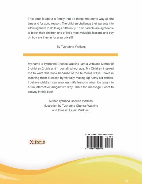 This book is about a family that do things the same way all the time and for good reason. The children challenge their parents into allowing them to do things differently. Their parents are agreeable to teach their children one of life's most valuable lessons and boy oh boy are they in for a surprise!!! By Tyshanna Watkins