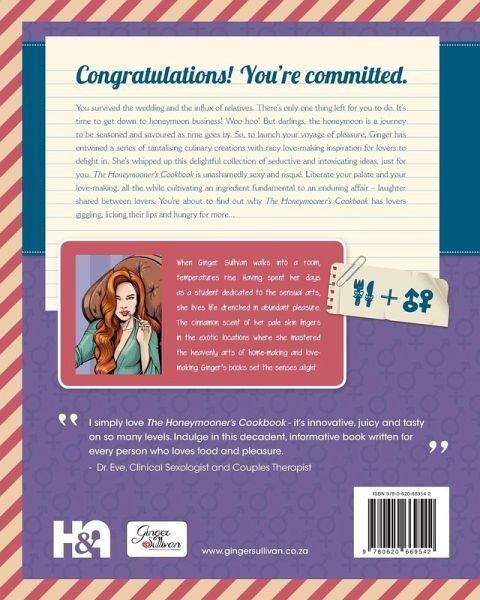 Congratulations! You’re committed. But what’s the secret ingredient in turning an ordinary honeymoon into a delicious and lasting love affair? You survived the wedding and the influx of relatives. There’s only one thing left for you to do. It’s time to get down to honeymoon business! Woo hoo! But darlings, the honeymoon is a journey to be seasoned and savoured as time goes by. So, to launch your voyage of pleasure, Ginger has entwined a series of tantalising culinary creations with racy love-making inspiration for lovers to delight in. She’s whipped up this delightful collection of seductive and intoxicating ideas, just for you. The Honeymooner’s Cookbook is unashamedly sexy and risqué. Liberate your palate and your love-making, all the while cultivating an ingredient fundamental to an enduring affair – laughter shared between lovers. You’re about to find out why The Honeymooner’s Cookbook has lovers giggling, licking their lips and hungry for more... "I simply love The Honeymooner’s Cookbook - it’s innovative, juicy and tasty on so many levels. Indulge in this decadent, informative book written for every person who loves food and pleasure." - Dr. Eve (Clinical Sexologist and Couples Therapist)