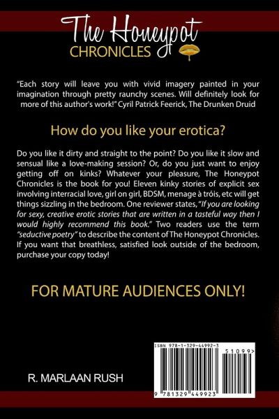 The Honeypot Chronicles is a collection of sex, stories of uninhibited lust and desire that will do more than just stimulate your senses. The characters could be anyone-your favorite cashier at the grocery store, your seemingly shy neighbor, or maybe the coworker who sits in the cubicle next to you. Indulge in their fantasies. Savor the sweetness men and women alike seek from the pleasurable little place tucked away between a set of thighs. Get your hands and other things sticky within The Honeypot.