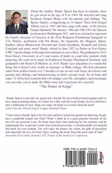 "Randy Spicer is not only my pastor but a friend. We have broken bread together and we have sung at nursing homes, so I know he walks with the Lord. Randy loves to fish but is also a fisherman of men. Hope you enjoy the book as it comes from his heart." Larry Parrish, Retired Major League Baseball Player "I have known Randy Spicer for 18 years and have heard him preach for that long. Randy has a wonderful insight into God's Word. I think he is a great preacher because of his love for our precious Lord. He hears from God when studying for his sermons, and he understands how to put into words what God has given him. I wholeheartedly recommend this book for your reading. You will enjoy his humor, his vision, his gifts of preaching and especially his love for God. Enjoy reading this book from this great man of God." Reverend Kent Miller, Retired UMC Pastor of the South GA Conference Randy Spicer has been in ministry since he got saved at the age of 8 in 1964. He traveled and sang Southern Gospel Music with his parents and siblings, The Spicer Family, evangelizing in 34 states! Their first Gospel Album was in 1967 and they sang with many of the known Gospel Quartets! On January 19th and 20th,1981 the Spicers performed in Washington, D.C. and were selected to represent the Family structure of America at the First Religious Presidential Inaugural in U.S. History, performed with Pat Boone, the Imperials, the Hoppers, Danny Gaither, James Blackwood, Howard and Vestal Goodman, Kenneth and Gloria Copeland and many more! Randy retired in June 2022 as Pastor at Fort Gaines UMC 3-point charge in Georgia but continues to serve there. He graduated in 2013 from Emory University in a 5-year course of study as a part time student while pastoring. He went on to study at Southwest Georgia Theological Seminary and graduated with Doctor of Ministry in 2018. Randy says education is a wonderful thing, but it doesn't only reside in seminary or Bible college. His best education came from endless hours over 5 decades of one on one with Jesus, devotions with parents and siblings, and brainstorming in God's eternal word. So sit back and enjoy 52 of his best sermons that will change your life, strengthen, and encourage you, provoke you to study the Bible more and experience for yourself, "The Honor of Kings"