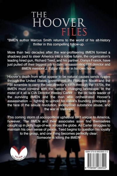 8MEN author Marcus Smith returns to the world of his alt-history thriller in this compelling follow-up. More than two decades after the war-profiteering 8MEN formed a shadowy pact to steer America into a noble future, the organization's leading hired gun, Richard Teed, and his partner, Danya Franck, have just pulled off their biggest job to date: assassinating FBI director and 8MEN member J. Edgar Hoover in his own home. Hoover's death from what appear to be natural causes sends ripples through the United States government. As President Nixon and the FBI scramble to carry the late director's torch through the 1970s, the 8MEN must contend with the nation's changing landscape. In the midst of it all is CIA Director Wesley Carter - the de facto leader of the surviving 8MEN and the man who orchestrated Hoover's assassination - fighting to uphold his cabal's founding principles in the face of the sexual revolution, widespread substance abuse, and the war in Vietnam. This coming storm of sociopolitical upheaval isn't unique to America, however. The 8MEN and their associates soon find themselves caught up in petty tugs-of-war across the globe. As Carter struggles to maintain his own sense of peace, Teed begins to question his loyalty to the group, and one thing becomes perfectly clear: Someone is killing the 8MEN!