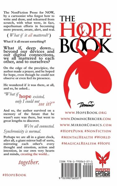 The Hope Book: What if Hope Existed, Only I Could Not See It? The NonFiction Prose for NOW, by a cartoonist who forgot how to write and draw, and relearned from scratch, with what were, in fact, superhuman efforts in becoming more present, aware, alert, and real. (What if it all mattered?) What if it all meant something?! What if, deep down... beyond our devices and our digital connections, we all mattered to each other, and to ourselves? On the edge of the precipice, the author made a prayer, and he hoped for hope, even though he could not observe or even feel its presence. He wondered if it was there, at all, and so, he asked... "What if hope existed, only I could not see it?" And so, the author survived on a memory of the future that he wasn't sure was there, but went to great lengths to discover. We're all connected. Synchronicity is normal. Perhaps we are all in a giant clock, after all, a giant mirror ball of sorts, mirroring each other's every thought and emotion, action and intention, in our own very hearts and minds, creating the world... together. #HopeBook