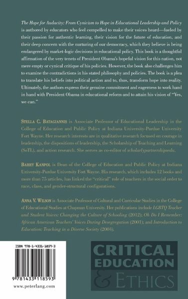 The Hope for Audacity: From Cynicism to Hope in Educational Leadership and Policy is authored by educators who feel compelled to make their voices heard - fueled by their passion for authentic learning, their vision for the future of education, and their deep concern with the nurturing of our democracy, which they believe is being endangered by market-logic decisions in educational policy. This book is a thoughtful affirmation of the very tenets of President Obama's hopeful vision for this nation, not mere empty or cynical critique of his policies. However, the book also challenges him to examine the contradictions in his stated philosophy and policies. The book is a plea to translate his beliefs into political action and to, thus, transform hope into reality. Ultimately, the authors express their genuine commitment and eagerness to work hand in hand with President Obama in educational reform and to attain his vision of «Yes, we can.»