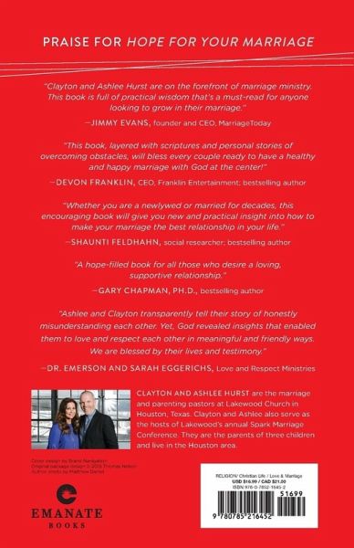 Clayton and Ashlee Hurst share the principles and Scripture they have learned to lean on and preach at Lakewood Church. Foreword by Joel Osteen. Are you willing to do whatever it takes to have the marriage you dreamed of? Interestingly, this is the question Clayton and Ashlee ask young couples before they get married and married couples in crisis. If they answer yes, then there is hope for the couple. If they are willing to commit to the hard work ahead, they have a very good shot. Hope for Your Marriage is a book designed for couples who desire to have the best marriage possible. Every marriage has the potential to be incredible when God is at the center. In Hope for Your Marriage, Clayton and Ashlee share personal stories on overcoming fairy-tale pitfalls; keeping Jesus at the center of your marriage; practicing healthy communication on sex, conflict, and forgiveness; declaring life over your marriage; and leaving a God-honoring legacy. Praise for Hope for Your Marriage: "Clayton and Ashlee Hurst are on the forefront of marriage ministry. This book is full of practical wisdom that's a must-read for anyone looking to grow in their marriage." --Jimmy Evans, founder and CEO, MarriageToday, Southlake, Texas "This book, layered with scriptures and personal stories of overcoming obstacles, will bless every couple ready to have a healthy and happy marriage with God at the center!" --DeVon Franklin, CEO, Franklin Entertainment; bestselling author "Whether you are a newlywed or married for decades, this encouraging book will give you new and practical insight into how to make your marriage the best relationship in your life." --Shaunti Feldhahn, social researcher, bestselling author "A hope-filled book for all those who desire a loving, supportive relationship." --Gary Chapman, PhD, bestselling author "Ashlee and Clayton transparently tell their story of honestly misunderstanding each other. Yet, God revealed insights that enabled them to love and respect each other in meaningful and friendly ways. We are blessed by their lives and testimony." --Dr. Emerson and Sarah Eggerichs, Love and Respect Ministries