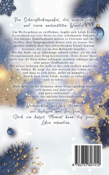 Von Schneeflockenzauber, der wahren Liebe und einem unerwarteten Wunder.Um Weihnachten zu entfliehen, begibt sich Lilah Evans kurzerhand auf eine Reise in eine unbekannte Zukunft.Ein kleines Familienhotel mitten in Colorado soll ihr helfen, ihre Vergangenheit hinter sich zu lassen. Sie möchte endlich über den schrecklichen Unfall hinweg kommen, der sie an den Rollstuhl fesselte.Mit der Ruhe ist es allerdings schnell vorbei, als sie den Rezeptionisten Jace King kennenlernt. Denn dieser lässt nicht nur ihr Herz höher schlagen, sondern schleppt gleich eine ganze Großfamilie mit an.Mit seiner lockeren Art hilft er ihr, sich endlich wieder frei zu fühlen.Er zeigt ihr, wie wertvoll das Leben ist und dass es sich lohnt, dafür zu kämpfen.Durch Jace lernt Lilah, wieder zu lieben und zu leben.Doch kann sie die Schatten ihrer Vergangenheit hinter sich lassen und Jace voll und ganz vertrauen? Oder reißt der nächste Schicksalsschlag alles auseinander?Weihnachten war wie träumen, wie loslassenund frei sein.Doch ein kurzer Moment kann das ganze Leben verändern.