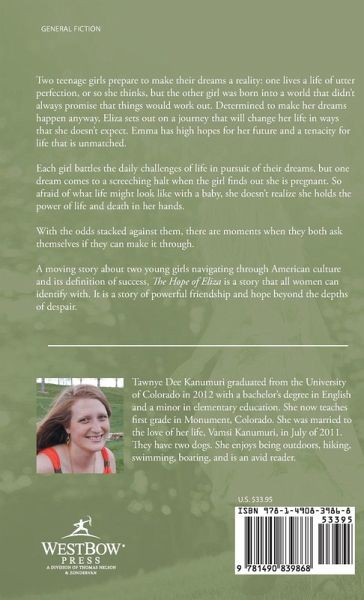 Two teenage girls prepare to make their dreams a reality: one lives a life of utter perfection, or so she thinks, but the other girl was born into a world that didn't always promise that things would work out. Determined to make her dreams happen anyway, Eliza sets out on a journey that will change her life in ways that she doesn't expect. Emma has high hopes for her future and a tenacity for life that is unmatched. Each girl battles the daily challenges of life in pursuit of their dreams, but one dream comes to a screeching halt when the girl finds out she is pregnant. So afraid of what life might look like with a baby, she doesn't realize she holds the power of life and death in her hands. With the odds stacked against them, there are moments when they both ask themselves if they can make it through. A moving story about two young girls navigating through American culture and its definition of success, The Hope of Eliza is a story that all women can identify with. It is a story of powerful friendship and hope beyond the depths of despair.