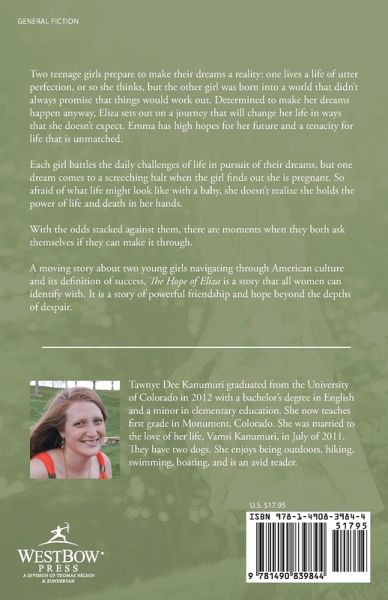 Two teenage girls prepare to make their dreams a reality: one lives a life of utter perfection, or so she thinks, but the other girl was born into a world that didn't always promise that things would work out. Determined to make her dreams happen anyway, Eliza sets out on a journey that will change her life in ways that she doesn't expect. Emma has high hopes for her future and a tenacity for life that is unmatched. Each girl battles the daily challenges of life in pursuit of their dreams, but one dream comes to a screeching halt when the girl finds out she is pregnant. So afraid of what life might look like with a baby, she doesn't realize she holds the power of life and death in her hands. With the odds stacked against them, there are moments when they both ask themselves if they can make it through. A moving story about two young girls navigating through American culture and its definition of success, The Hope of Eliza is a story that all women can identify with. It is a story of powerful friendship and hope beyond the depths of despair.