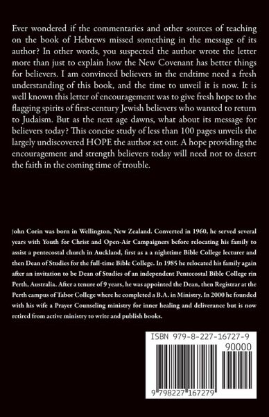 Ever wondered if the commentaries and other sources of teaching on the book of Hebrews missed something in the message of its author? In other words, you suspected the author wrote the letter more than just to explain how the New Covenant has better things for believers. I am convinced believers in the endtime need a fresh understanding of this book, and the time to unveil it is now. It is well known this letter of encouragement was to give fresh hope to the flagging spirits of first-century Jewish believers who wanted to return to Judaism. But as the next age dawns, what about its message for believers today? This concise study of about 100 pages unveils the largely undiscovered HOPE the author set out. A hope providing the encouragement and strength believers today will need not to desert the faith in the coming time of trouble.