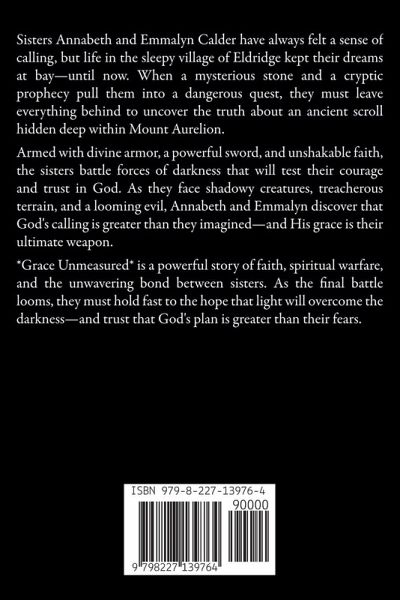 Sisters Annabeth and Emmalyn Calder have always felt a sense of calling, but life in the sleepy village of Eldridge kept their dreams at bay-until now. When a mysterious stone and a cryptic prophecy pull them into a dangerous quest, they must leave everything behind to uncover the truth about an ancient scroll hidden deep within Mount Aurelion. Armed with divine armor, a powerful sword, and unshakable faith, the sisters battle forces of darkness that will test their courage and trust in God. As they face shadowy creatures, treacherous terrain, and a looming evil, Annabeth and Emmalyn discover that God's calling is greater than they imagined-and His grace is their ultimate weapon. *Grace Unmeasured* is a powerful story of faith, spiritual warfare, and the unwavering bond between sisters. As the final battle looms, they must hold fast to the hope that light will overcome the darkness-and trust that God's plan is greater than their fears.