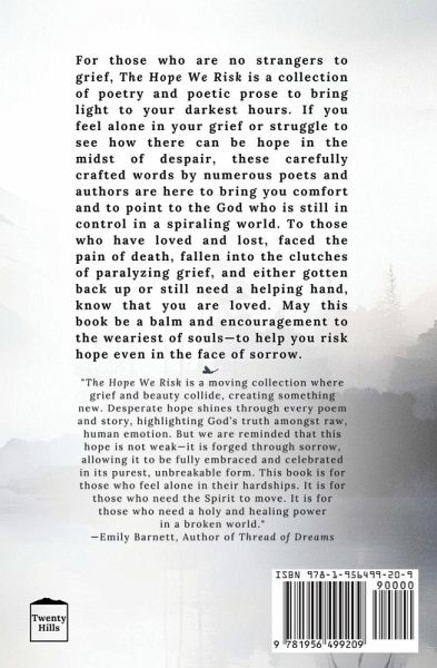 For those who are no strangers to grief, The Hope We Risk is a collection of poetry and poetic prose to bring light to your darkest hours. If you feel alone in your grief or struggle to see how there can be hope in the midst of despair, these carefully crafted words by numerous poets and authors are here to bring you comfort and to point to the God who is still in control in a spiraling world. To those who have loved and lost, faced the pain of death, fallen into the clutches of paralyzing grief, and either gotten back up or still need a helping hand, know that you are loved. May this book be a balm and encouragement to the weariest of souls-to help you risk hope even in the face of sorrow.