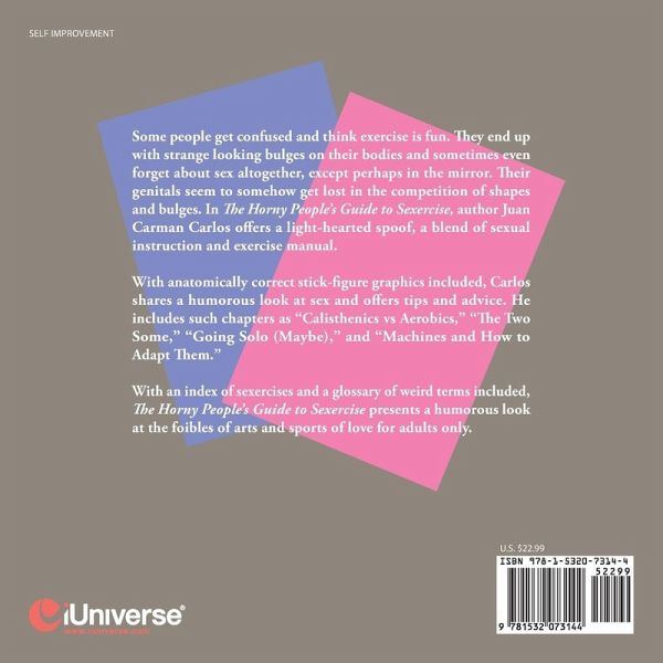 Some people get confused and think exercise is fun. They end up with strange looking bulges on their bodies and sometimes even forget about sex altogether, except perhaps in the mirror. Their genitals seem to somehow get lost in the competition of shapes and bulges. In The Horny People's Guide to Sexercise, author Juan Carman Carlos offers a light-hearted spoof, a blend of sexual instruction and exercise manual. With anatomically correct stick-figure graphics included, Carlos shares a humorous look at sex and offers tips and advice. He includes such chapters as "Calisthenics vs Aerobics," "The Two Some," "Going Solo (Maybe)," and "Machines and How to Adapt Them." With an index of sexercises and a glossary of weird terms included, The Horny People's Guide to Sexercise presents a humorous look at the foibles of arts and sports of love for adults only.
