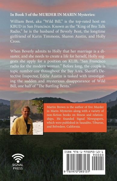 In Book 5 of the MURDER IN MARIN Mysteries:William Bent, aka "Wild Bill," is the top-rated host on KBUD in San Francisco. Known as the "King of Bro Talk Radio," he is the husband of Beverly Bent, the longtime girlfriend of Karin Timmons, Sharon Austin, and Holly Cross.When Beverly admits to Holly that her marriage is a disaster, and she needs to create a life for herself, Holly suggests she apply for a position on KLIB, "San Francisco radio for the modern woman." Before long the couple is topic number one throughout the Bay Area. Sheriff's Detective Inspector, Eddie Austin is tasked with investigating the sudden and mysterious disappearance of Wild Bill, one half of "The Battling Bents."