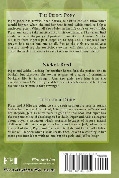 The Penny Pony Piper Jones has always loved horses, but little did she know what would happen when she and a friend tried to help a neglected pony. They must find a safe haven for the pony and protect it from its cruel owner. But as the girls try to solve a mystery involving the suspicious owner, will they be forced into crime themselves in order to save their new-found pony friend? Nickel-Bred Piper and Addie find the perfect horse, Nickel, but discover the owner is part of a gang of criminals. Nickel's life is in danger. Can the girls save him from the slaughterhouse? Turn on a Dime Piper's friend, Miss Julie, rents rooms to Cassie and her stepson, Jeff. Cassie has been given the responsibility of checking on Cassie's pregnant mare. Piper doesn't like boys, but as she gets to know and accept Jeff, he is accused of theft, so Piper and her best friend defend him. What will happen when Cassie steals, then leaves the country as her mare goes into labor with no one but the girls and Jeff to help?
