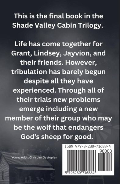 This is the final book in the Shade Valley Cabin trilogy. Life has come together for Grant, Lindsey, Jayvion, and their friends. However, tribulation has barely begun despite all they have experienced. Through all of their trials new problems emerge including a new member of their group who may be the wolf that endangers God's sheep for good. Young Adult Christian, Romance, Dystopian