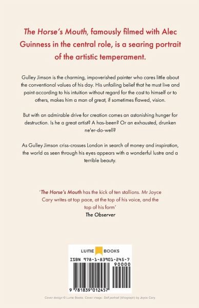 The Horse's Mouth, famously filmed with Alec Guinness in the central role, is a searing portrait of the artistic temperament. Gulley Jimson is the charming, impoverished painter who cares little about the conventional values of his day. His unfailing belief that he must live and paint according to his intuition without regard for the cost to himself or to others, makes him a man of great, if sometimes flawed, vision. But with an admirable drive for creation comes an astonishing hunger for destruction. Is he a great artist? A has-been? Or an exhausted, drunken ne'er-do-well? As Gulley Jimson criss-crosses London in search of money and inspiration, the world as seen through his eyes appears with a wonderful lustre and a terrible beauty. 'The Horse's Mouth has the kick of ten stallions. Mr Joyce Cary writes at top pace, at the top of his voice, and the top of his form' - The Observer
