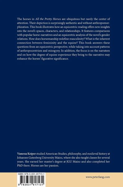 The horses in All the Pretty Horses are ubiquitous but rarely the center of attention. Their depiction is surprisingly authentic and without anthropomorphization. This book illustrates how an equicentric reading offers new insights into the novel's spaces, characters, and relationships. It features comparisons with popular horse-narratives and an equicentric analysis of the novel's gender relations. How does horsemanship redefine masculinity? What is the inherent connection between femininity and the equine? This book answers these questions from an equicentric perspective, while taking into account patterns of anthropocentrism and misogyny. In addition, the focus is on the narratees and on how the degree of equine experience they bring to the narrative may enhance the horses' figurative significance.