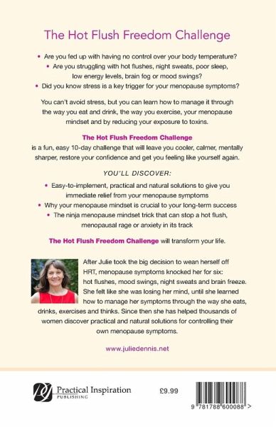 Julie Dennis specialises in practical and natural solutions for controlling menopause symptoms and has helped 1000s of women through her popular online programme the Hot Flush Freedom Challenge and her bespoke VIP work. She is an experienced speaker and has been quoted in the Telegraph magazine Stella, featured on Psychologies Life Labs and was published as part of the Guardian campaign to raise awareness around menopause in 2016. Julie was prescribed HRT following a hysterectomy in her early 30s and assumed this was a 'cure' for menopause. In search of new challenges following an early corporate career she qualified as a personal trainer and nutrition adviser. She focused on working with older women and soon discovered one of their key concerns was controlling menopause symptoms. She embarked on extensive research in the field and was shocked to discover HRT was a 'band aid', not a cure, and took the big decision to wean herself off it. Menopause symptoms knocked her for six: hot flushes, mood swings, night sweats and brain freeze all appeared in quick succession. She felt like she was losing her mind. With the help of a menopause mentor Julie was gradually able to put in place the changes that enabled her to get back on track with her health and business, and since then she has devoted herself to helping women manage this vitally important but little talked-about life stage.